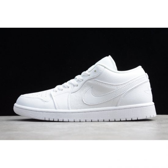 This version of the low-top Air Jordan 1 features a White tumbled leather, unlike the 2015 pair that came built in full smooth leather, with smooth leather overlays. The only hit of color is seen on the branded tongues and back Wings heel tab done in Pure Platinum. Also known as"Triple White," the monochromatic colorway sees the shoe's smooth and tumbled leather construction dressed entirely in white with the exception of Jumpman tongue branding and Wings logo at the heel in Pure Platinum.
