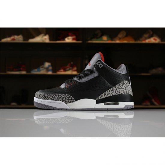 The Air Jordan 3"Black Cement" is a black and grey version of Michael Jordan's third signature shoe. It originally released in 1988, followed by 1994, 2001, 2008, and 2011 featuring a mix of leather, elephant print, and visible Air. It consists of a Black leather upper offset by the Elephant print on the heel and toe mudguards, the Fire Red on the Jumpman on the tongue, lining, parts of the outsole and eyelets, the Cement Grey on the tongue, ankle collar and eyestay, the White and Black midsole and of course, the Nike Air branding on the heel in White.
