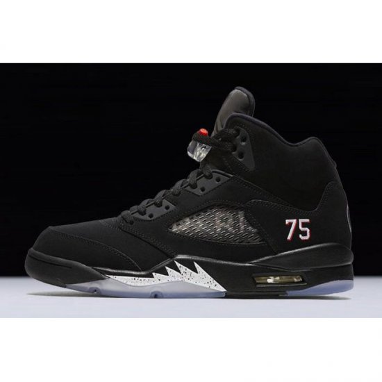 This Air Jordan 5 pays homage to PSG, the Paris Saint-Germain Football (soccer) club, and comes with an all-black nubuck upper and Black Jumpman logo on the tongue. This Air Jordan 5 is highlighted with"Paris" text on the netting and number"75" stitching which refers to Paris' zip code. red and white stripes on the heel, and a Paris Saint-Germain logo on the heel, A black midsole and an icy blue translucent with the Paris Saint-Germain logo inside of it complete the look.